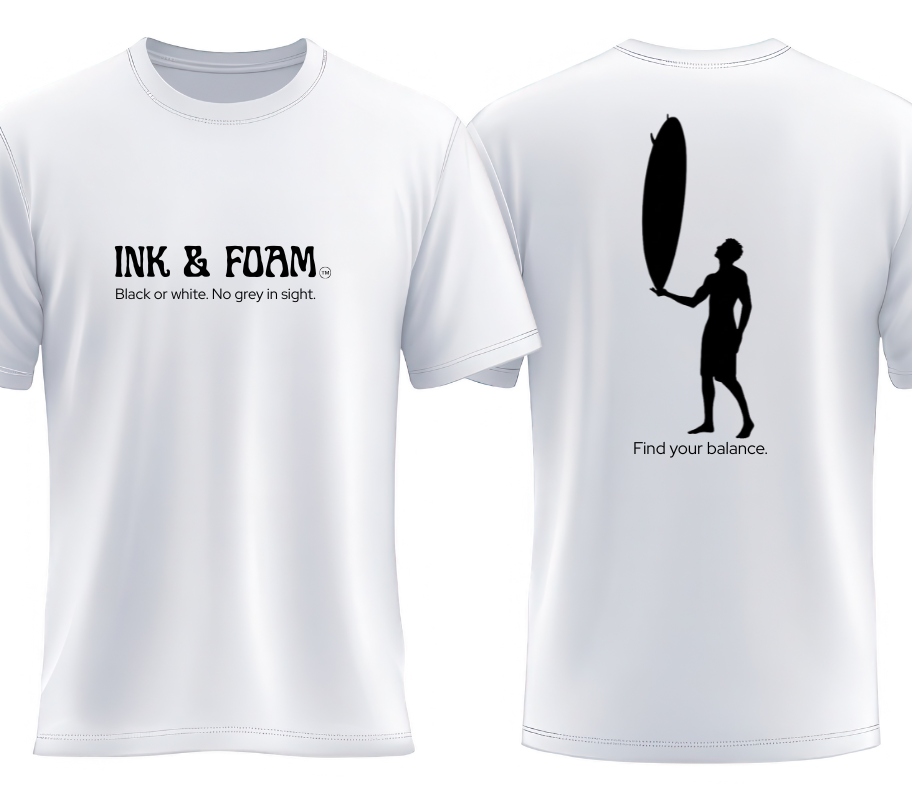 "Find your balance" captures the truth every coastal soul understands — balance isn’t just a skill, it’s a lifestyle. Minimal, black-and-white and grounded in Ink & Foam’s unshaded philosophy, this design blends fun with quiet meaning. It’s for those who know that life constantly shifts, yet we adjust, steady ourselves, and ride anyway. A reminder to keep your humour, keep your rhythm, and find your balance — on the wave and everywhere else.